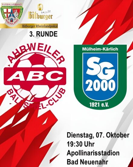 Der Spieltermin steht fest! In der 3. Runde des Rheinlandpokals empfängt der Ahrweiler BC die SG 2000 Mülheim-Kärlich. 📅 Dienstag, 07. Oktober ⏰ Anstoß: 19:30... Read More