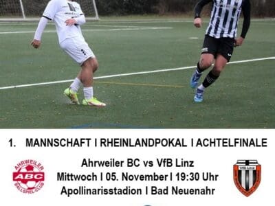 Am kommenden Mittwoch, 5. November, empfängt der Ahrweiler BC den VfB Linz im Achtelfinale des Rheinlandpokals. Anstoß ist um 19:30 Uhr, gespielt... Read More
