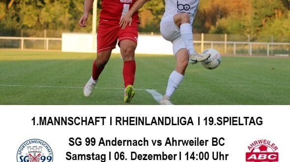 Der Ahrweiler BC tritt am Samstag zum letzten Pflichtspiel des Jahres bei der SG 99 Andernach an. Auf dem Kunstrasen erwartet die Mannschaft eine formstarke Gastgeberelf, die zuletzt drei Siege in Folge feierte und mit 30 Punkten aus 18 Partien auf Rang acht steht. Unter Trainer Kim Kossmann, der unlängst sein Engagement verlängerte, wirkte Andernach zuletzt stabil und äußerst kompakt. Im Hinspiel siegten die Kreisstädter mit 5:2. Für das Team von Mike Wunderlich geht es darum, eine überzeugende Hinrunde sowie ein starkes Kalenderjahr mit einer fokussierten Vorstellung abzurunden. Der ABC nimmt seine Favoritenrolle an, weiß jedoch um die Intensität und die besonderen Momente eines Derbys. Präzision im Ballbesitz, klare Abläufe und Geduld im letzten Drittel sollen die Grundlage bilden. Gleichzeitig setzt die Mannschaft auf die Unterstützung der eigenen Anhänger, die auch in Andernach gebraucht werden. Ein großer Tross aus ABC-Fans soll dem Team Rückhalt geben und für spürbare Präsenz auf fremdem Platz sorgen.