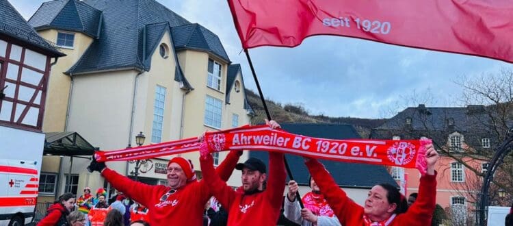 Es gibt Tage, an denen selbst der Himmel zögert. Rosenmontag in Ahrweiler war so einer: ein Wetter, das zwischen Niesel und Nostalgie pendelte. Und doch schob sich der Tross des Ahrweiler BC wie ein rot-weißes Ausrufezeichen durch die Gassen rund um die alten Stadtmauern – mit deutlich über 100 Närrinnen und Narren, Aktiven und Coaches der Nachwuchsabteilung, Oldies, komplettem Vorstand und mittendrin: Vereinspräsident Gerd Treffer sowie sein Vorgänger Frank Schönherr.