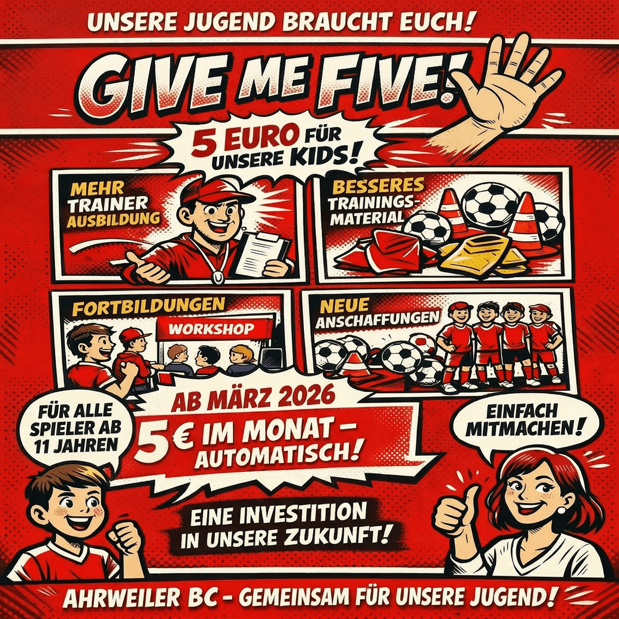 ab sofort führt der Ahrweiler BC eine kleine, aber wirkungsvolle Initiative ein: „Give Me Five“ – monatlich 5 € pro Jugendlichem ab 11 Jahren, zweckgebunden für Trainerausbildungen und hochwertiges Trainingsmaterial.