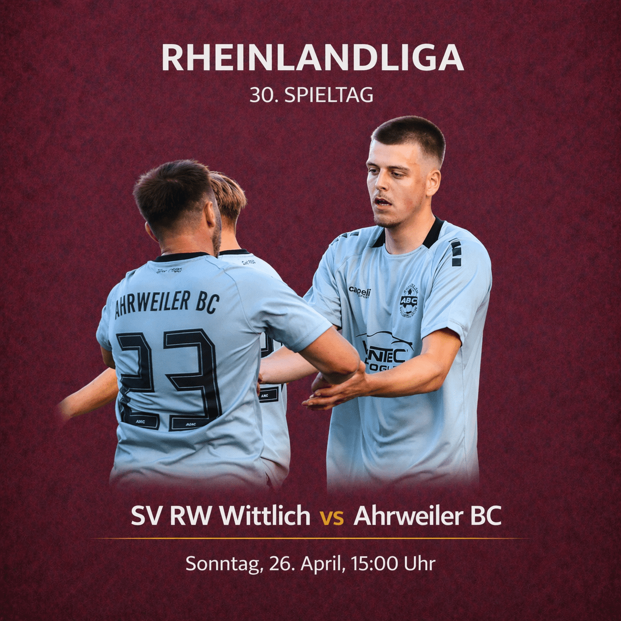 Am Sonntag um 15:00 Uhr steht für den Ahrweiler BC die nächste große Aufgabe auf dem Programm. Am 30. Spieltag der Rheinlandliga gastiert der Spitzenreiter beim Tabellenzweiten SV Rot-Weiß Wittlich. In der Säubrennerstadt wartet damit das Topspiel der Liga.